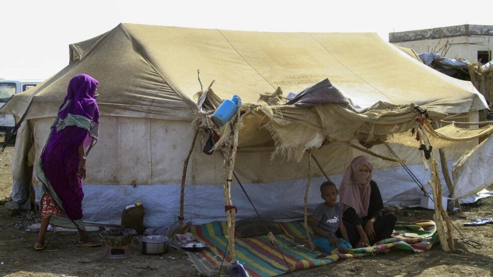 Unos desplazados que huyeron de los estados sudaneses de Jartum y Jazira, sentados a la sombra en sus tiendas de un campamento en el sureño estado de Gadaref el 20 de marzo de 2024 © – / AFP